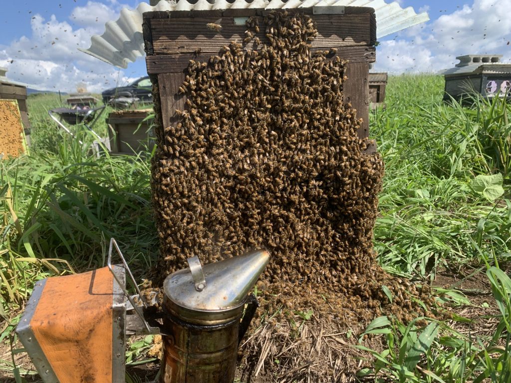 蕎麦の花が咲き揃った蜂場では、雨が少なく晴天に恵まれた天候と蜜源が豊富な環境で産卵が一段と活発になり、群勢も目に見えて増加!空中を舞いながら次々と花へ飛び立っていきます。