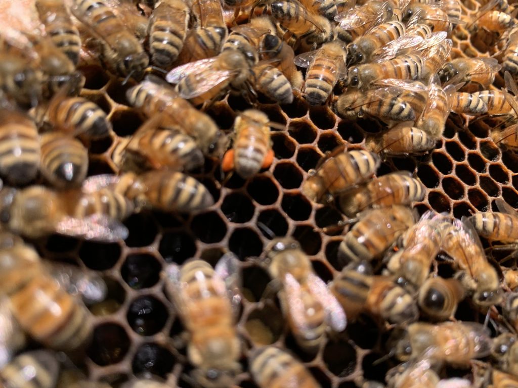 越冬に備えて貯蜜量の確認をしていると、ちらほらと花粉団子をつけたミツバチが。