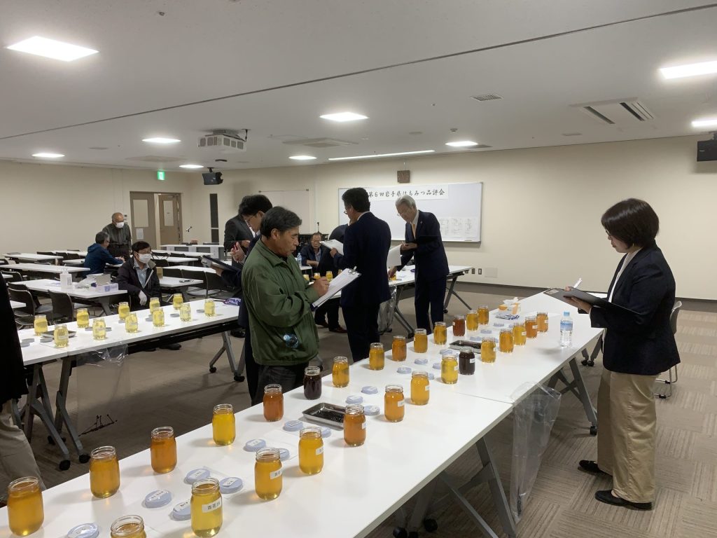 県内の養蜂家が出品した蜂蜜がずらりと並び、各部門20~30点ほどのエントリー。